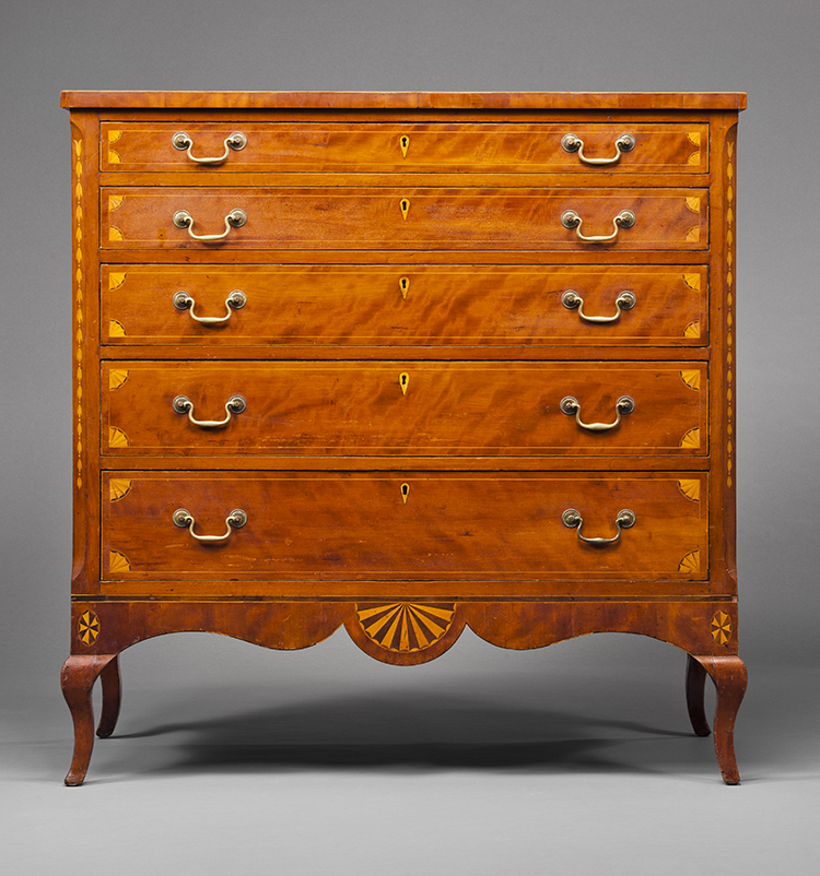 Images (L-R): Chest of Drawers, Workshop of Gerrard Calvert, Mason County, Kentucky. 1795-1800 Cherry, light and dark wood inlays, poplar HOA: 42 3/8”; WOA: 41 ¾”; DOA: 21 3/8” The Museum of Early Southern Decorative Arts at Old Salem Museums & Gardens MESDA Purchase Fund (5691.1)
