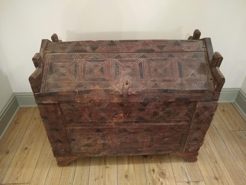 This painted East European chest, probably Romanian but possibly Hungarian, is in need of a new home. It is 3ft 3in wide, 1ft 10in deep and 2ft 9in high (99cm x 56cm x 84cm). Members who went on the Transylvanian trip in 2012 will remember seeing similar examples. This type of chest was still being made in the 19th and 20th centuries.